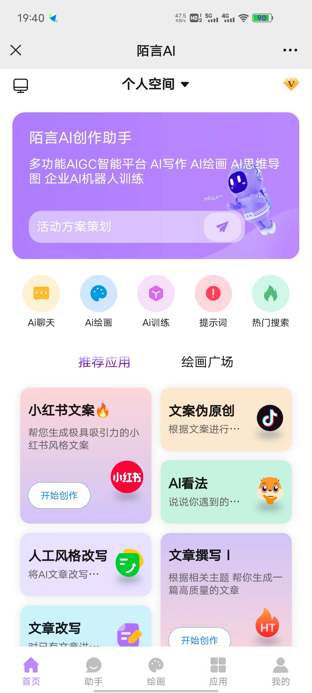陌言AI支持Midjourney繪畫功能,為你的寫作、情感、娛樂和繪畫提供了一站式體驗。
