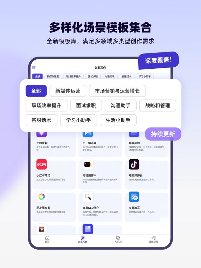 AI模板覆蓋各行各業:新媒體運營、市場營銷、增長運營、職場效率提升、溝通助手、面試求職、電商客服、校園學習、語言翻譯、生活情感、企業戰略管理等