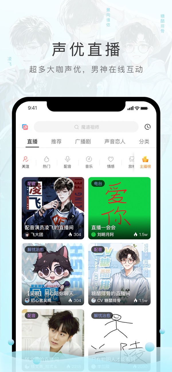 語音直播 - 匯集中日知名 CV、二次元、段子手、催眠等不同領域的大咖主播;開啟語音連麥,和大咖互動,用聲音交友;做主播,被搭訕被打賞,從此生活奔小康!