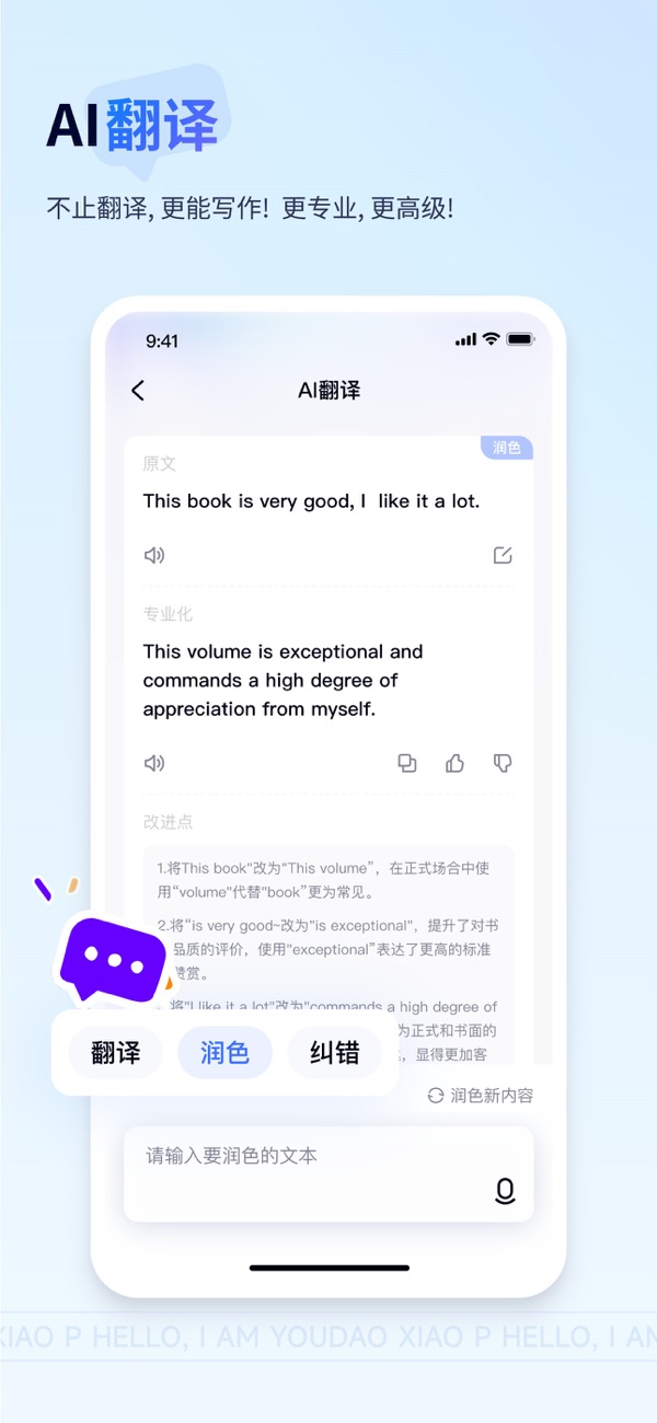 AI翻譯:同樣結合AI大模型對用戶輸入的原文進行個性化服務,支持對原文進行更專業的翻譯;潤色,從專業化、口語化維度去優化,也可以對原文進行語法用詞進行糾錯。