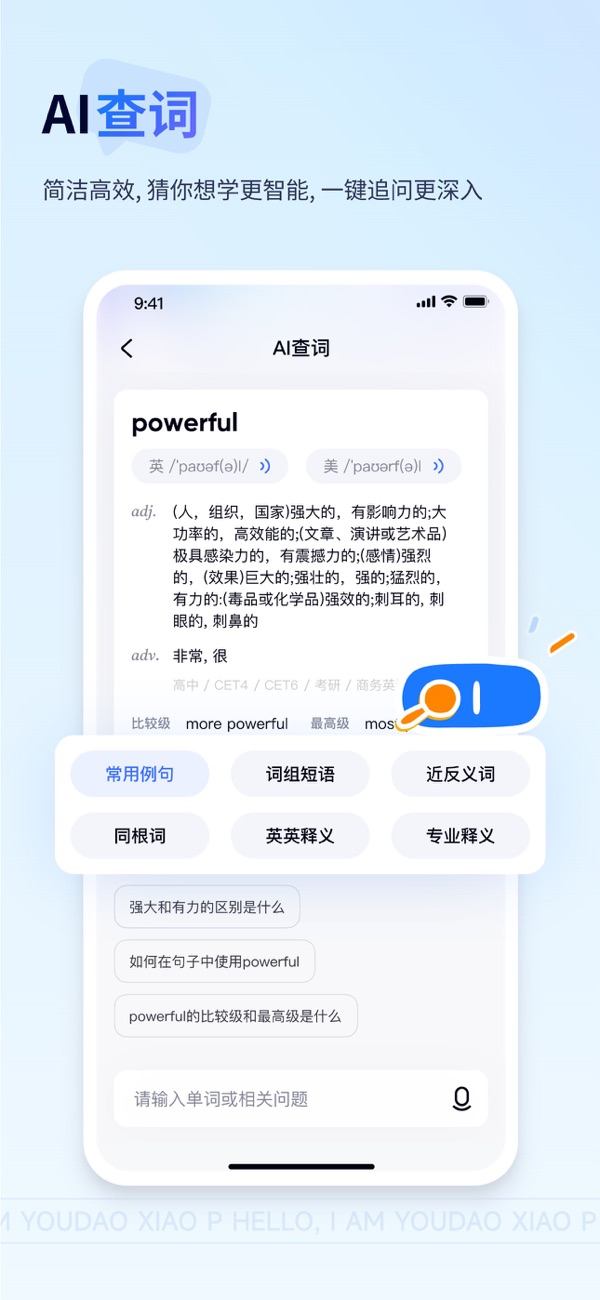 AI查詞:有道小P基于用戶輸入實時提示補齊完整單詞,并實時展示對應發音、音標,提供英音和美音發音示例,以及對應釋義。并結合A1提供基于該單詞的擴展需求如短句、例句、單詞精講、詞匯用法、單詞記憶等,更智能,更高效。交互式回答語言學習問題,單詞學習從被動吸收既有知識進化為生成式搜索,解決傳統詞典無法回答的個性化問題。
