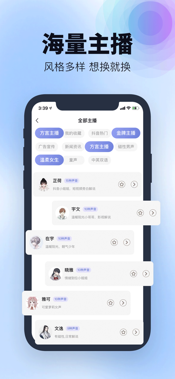 海量主播:近300款優質聲音,風格多樣,想換就換,效果震撼;