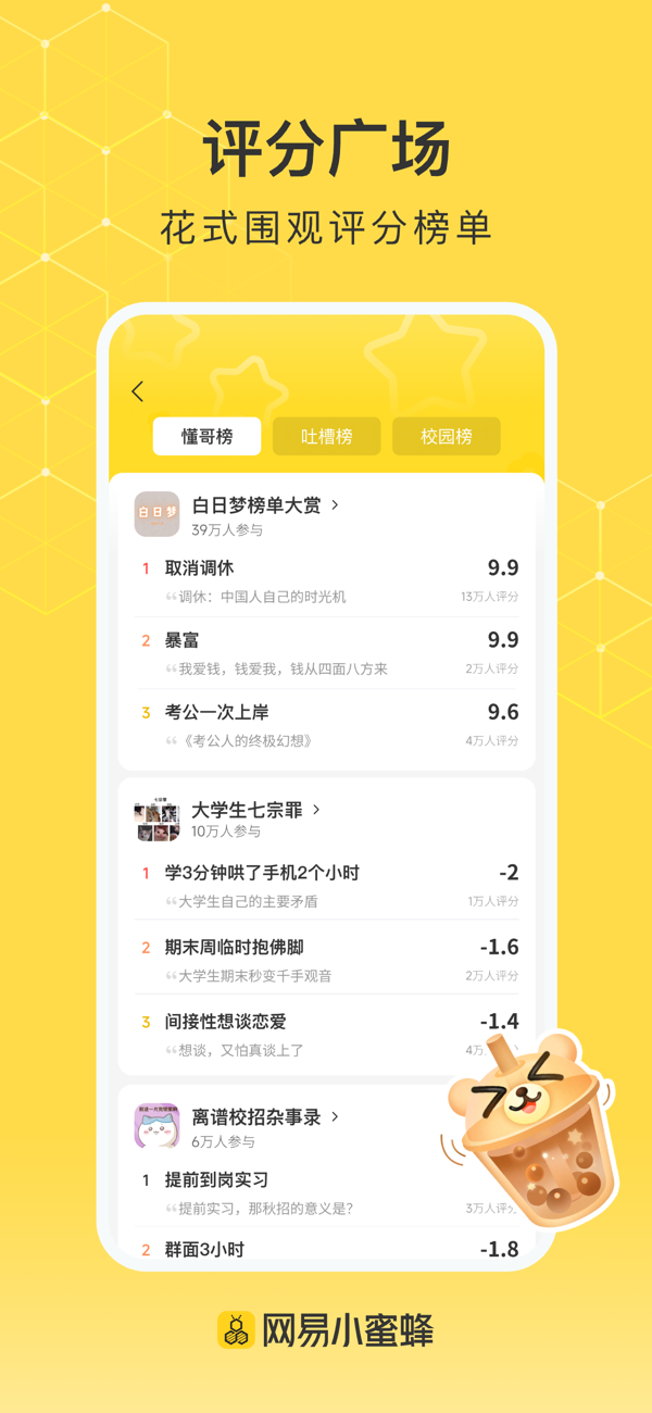 有趣:你可以創建話題、參與話題內容共建和對話題評分,而且還能花式圍觀懂哥榜、吐槽榜、校園榜等各種豐富、有趣的評分榜單!
