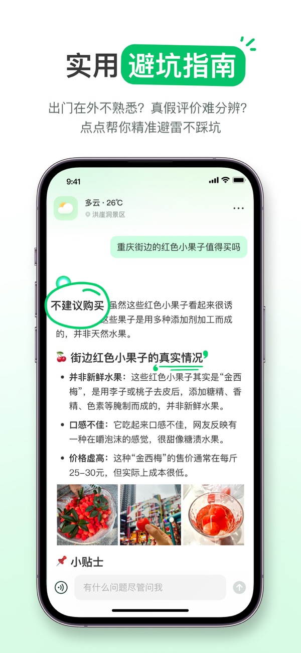 超級避坑指南:點點總結了大量生活經(jīng)驗,幫助用戶在旅行、選餐廳、人際交往等方面精準避坑。